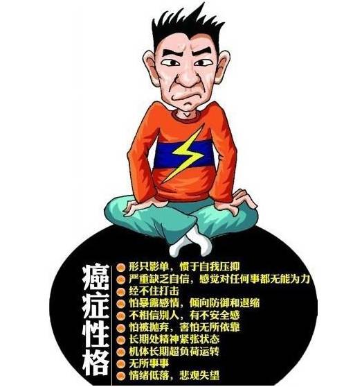 孤僻,抑郁,多疑善感,好生闷气,自我体验深刻却不愿意表露;沉默寡言,处事冷淡;心胸狭窄,常钻牛角尖,容易记仇,报复心强;易躁易怒,耐受力差;看什么都不顺眼,喜欢抱怨,有外人就跟外人闹别扭,没有外人就跟自己闹别扭。抑郁好生闷气,并常常带气吃饭易患胃癌。长期处于失望自卑中的女性易患宫颈癌。压抑不得释放,经常克己情绪折磨者易患肺癌。怒气难以自治,又常常压抑愤怒易患乳腺癌检查出癌症后加重了“癌性格”的患者,早早地都死了,可谓越怕死,死得越快。知道自己得了癌症,试着改变自己“癌性格”的,相当多的老“癌”存活下来。真是应了一句老话“性格即命运”。